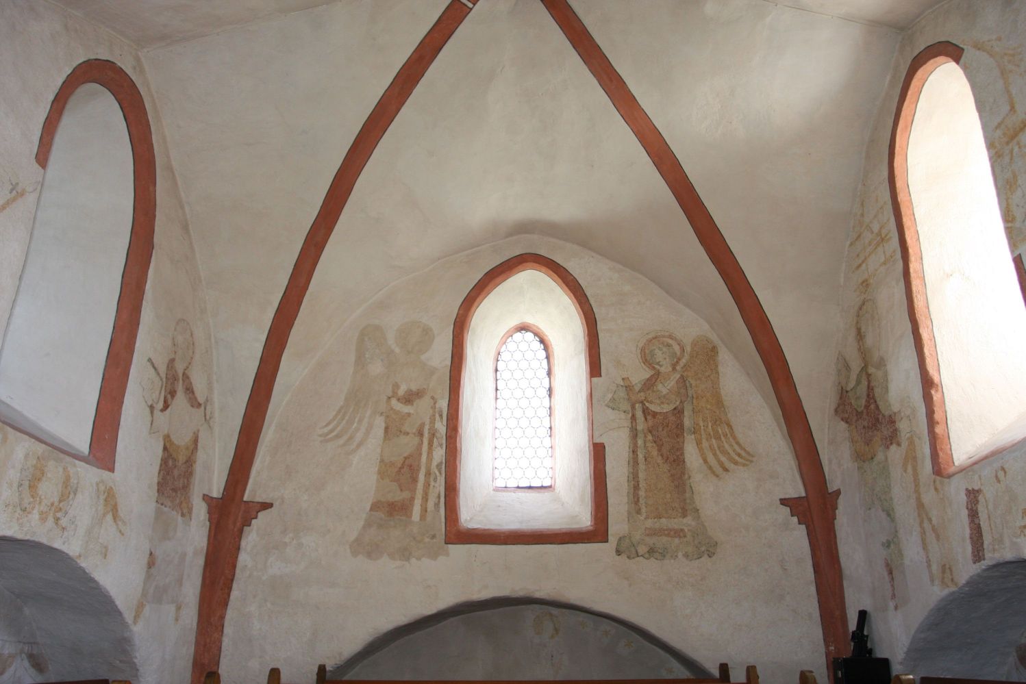 /in Breitscheid, KircheDer Chorraum der Breitscheider Kirche birgt etwas besonderes. Bei den umfassenden Baumaßnahmen im Rahmen der Renovierung der Kirche im Jahr 1970 wurden im Chorraum bis dahin übertünchte Wandmalereien wiederentdeckt. Die Wandgemälde zeigen unter anderem einen Ritter mit schwarzen Kreuz, Petrus, zwei Engel, Paulus und auch Kranke; manches ist nicht mehr zu erkennen.