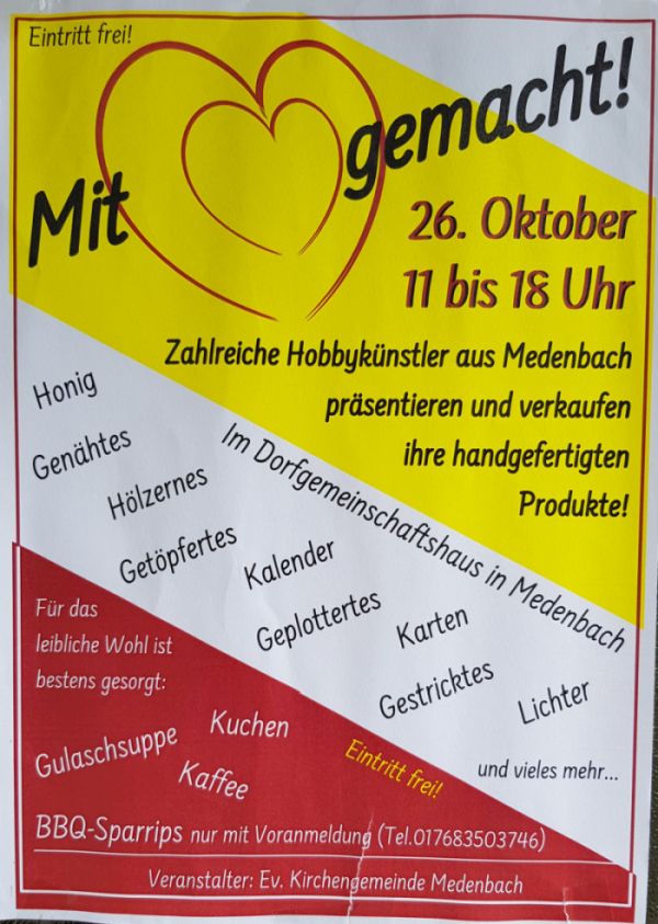 Mit Herz gemacht!20. Oktober 2019/in Allgemein 26. Oktober 2019 – 11 bis 18 Uhr Zahlreiche Hobbykünstler aus Medenbach präsentieren und verkaufen ihre handgefertigten Produkte im Dorfgemeinschaftshaus in Medenbach! Herzliche Einladung! https://www.evkbm.de/wp-content/uploads/2022/12/evkbm-logo-2.png 0 0 Thorsten Reichel https://www.evkbm.de/wp-content/uploads/2022/12/evkbm-logo-2.png Thorsten Reichel2019-10-20 16:55:462019-10-20 17:06:45Mit Herz gemacht!