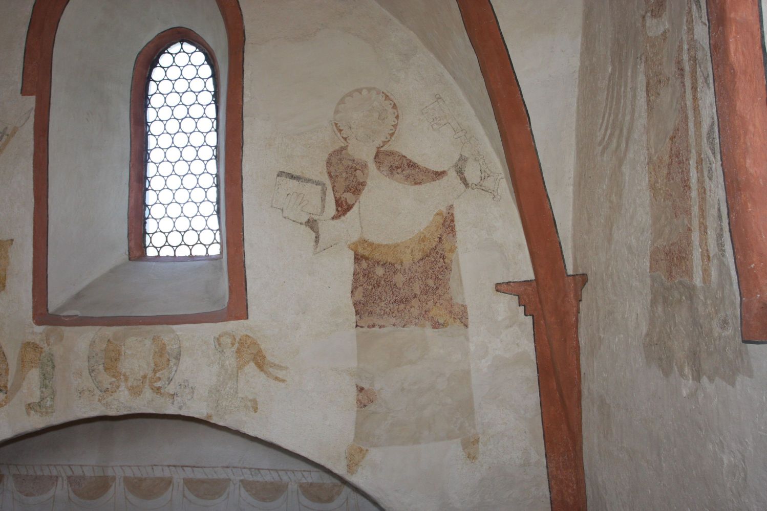 /in Breitscheid, KircheDer Chorraum der Breitscheider Kirche birgt etwas besonderes. Bei den umfassenden Baumaßnahmen im Rahmen der Renovierung der Kirche im Jahr 1970 wurden im Chorraum bis dahin übertünchte Wandmalereien wiederentdeckt. Die Wandgemälde zeigen unter anderem einen Ritter mit schwarzen Kreuz, Petrus, zwei Engel, Paulus und auch Kranke; manches ist nicht mehr zu erkennen.